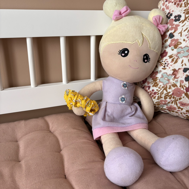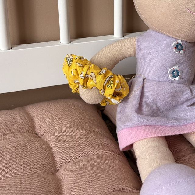 Chouchou pour enfant cousu main, avec un joli motif de parapluies. Doux et pratique, il apporte une touche amusante et colorée aux coiffures.