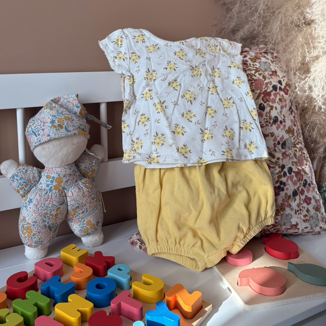 Apportez une touche de douceur et de fraîcheur à la garde-robe de bébé avec cet adorable ensemble composé d’un t-shirt à petite fleur et d’un short jaune. Léger et confortable, il est parfait pour les journées ensoleillées !