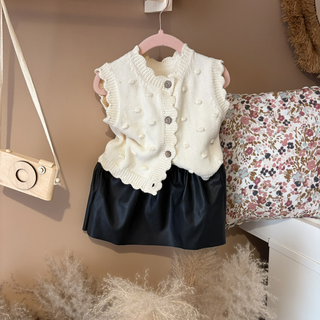 Offrez à votre petite une touche de douceur et d’élégance avec ce ravissant gilet sans manches crème, parfait pour la mi-saison. Son design épuré et sa matière douce en font un essentiel du dressing des tout-petits.